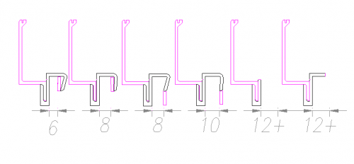 The image below illustrates how the multi-fit runner should be prepared to fit different thicknesses of glass. The runner includes a tab (highlighted in pink) that can bent into the correct shape to fit the appropriate thickness of glass (6-8mm). A guideline moulded into the runner will highlight where to make the bend. The tab is quite robust so it holds the runner into position so some force will be required to bend it into shape.